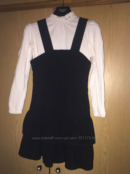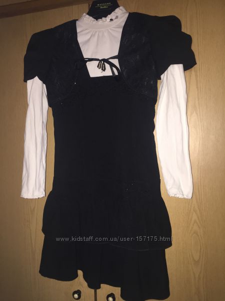 Продам школьный сарафан и болеро, можно по отдельности.Сарафан : на рост 140см. Шейки на спинке застёгиваются на пуговичках,можно регулировать, молния с боку на талии, модель приталенная, слегка обтекает по фигуре. На груди красивые блестящие чёрные камешки, с низу по юбке два валанчика и не большой бантик и тоже в камешках. Очень стильный сарафан.