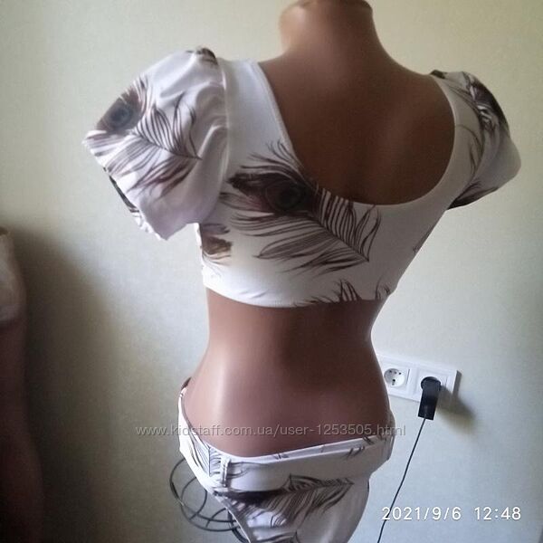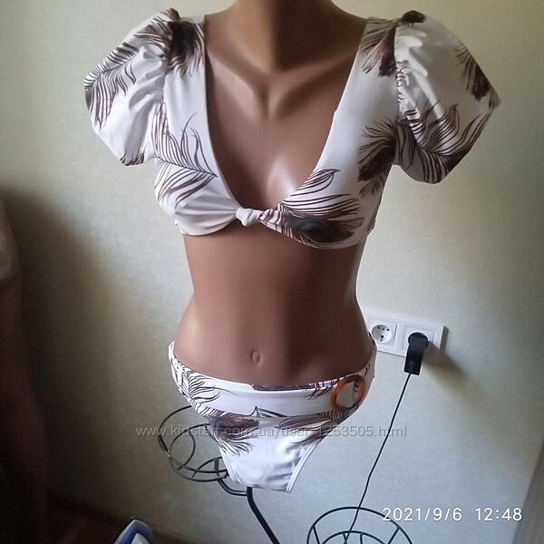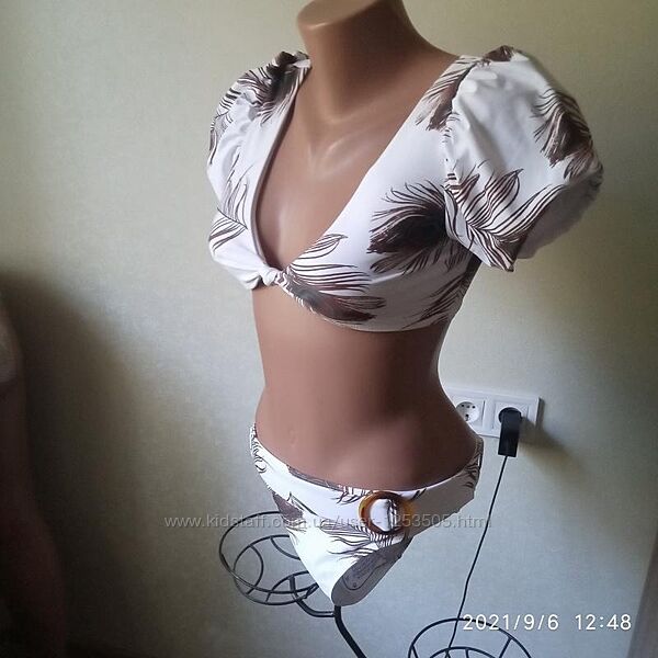 Стильный купальник топ с рукавом фонарик и высокими плавками
