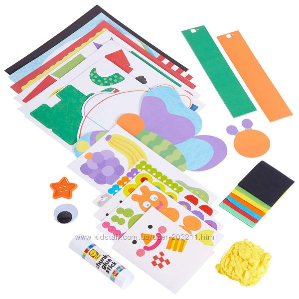 Отличный набор для развития мелкой моторики! 8 индивидуальных проектов, каждый отдельно упакован, очень удобно заниматься с ребенком - все под рукой! В наборе также большой клей карандаш фиолетового цвета, с которым детки легко видят где уже намазали, который при высыхании становится прозрачным. В наборе: клей-карандаш, 186 наклеек и бумажных форм, мятая бумага, 105 квадратиков из салфетной бумаги, глаз, пуговица, инструкции (на английском языке).