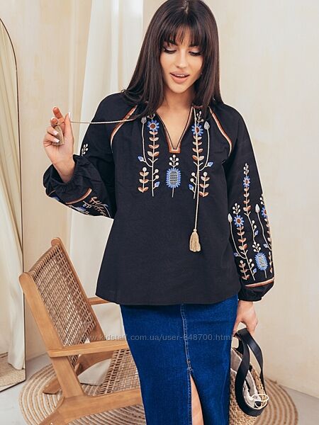 Хлопковая вышиванка из высококачественного турецкого материала прямого кроя. Модель с V-образным вырезом на завязках с кисточками. Длинные рукава-регланы с манжетами на резинке. Полочка и рукава декорированы цветочной вышивкой.