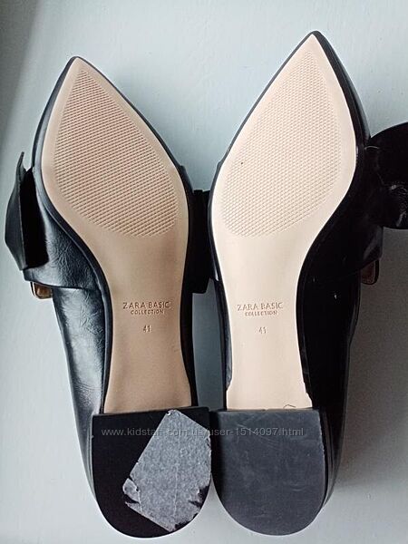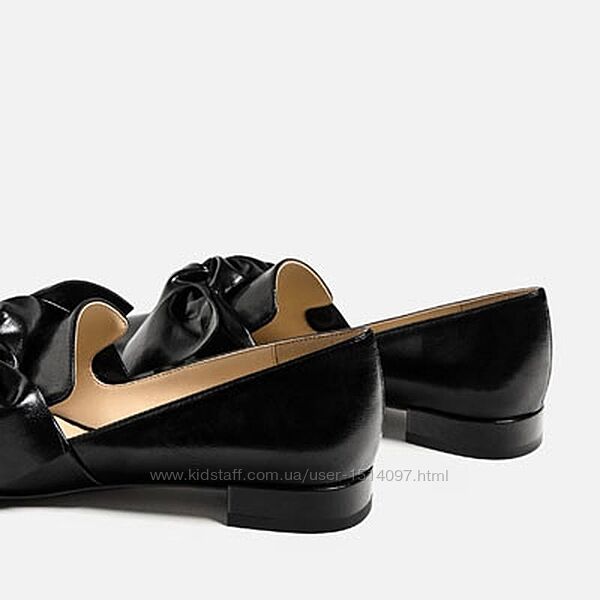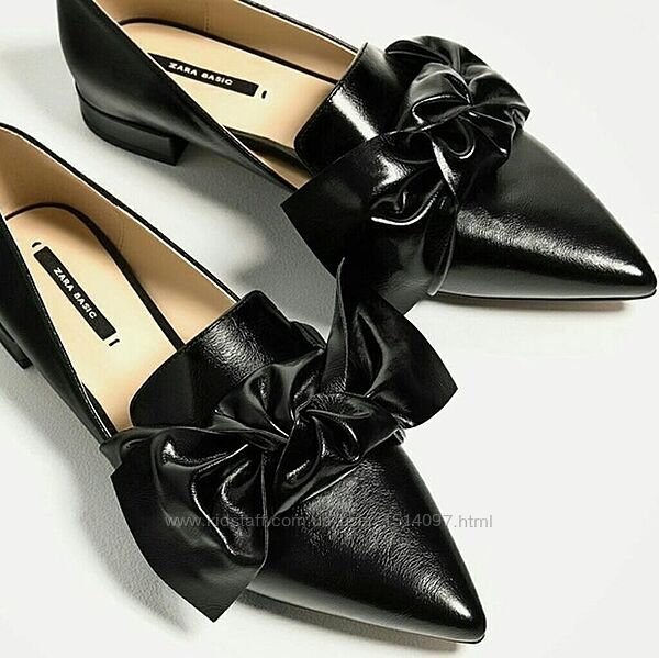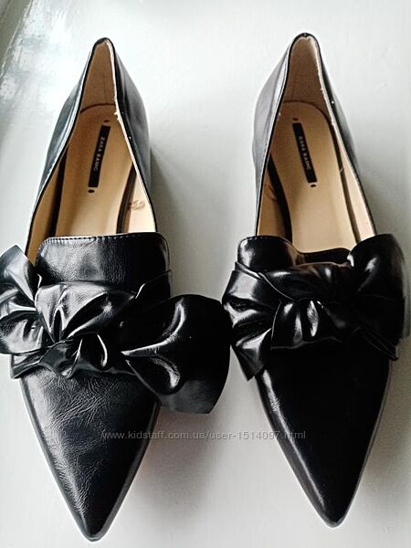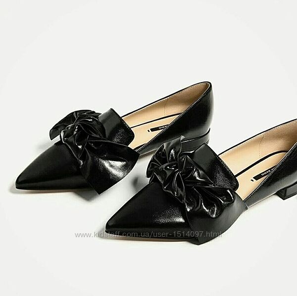 Чёрные туфли на плоской подошве, с острым носком и бантом на подъёме.Высота каблука 2 см.
