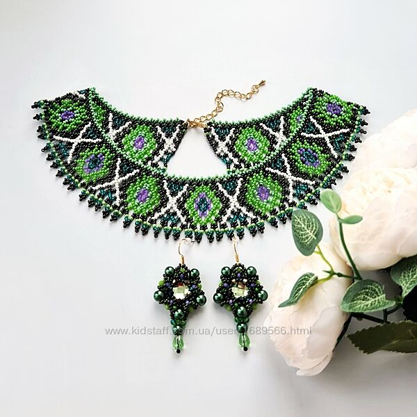 Розміри. Кольє: ширина 4 см, довжина 39-47 см, вага 43 г. Добрезаокруглюється та лягає як комірець. Сережки 2,5х4,5 см. Матеріали: чеський