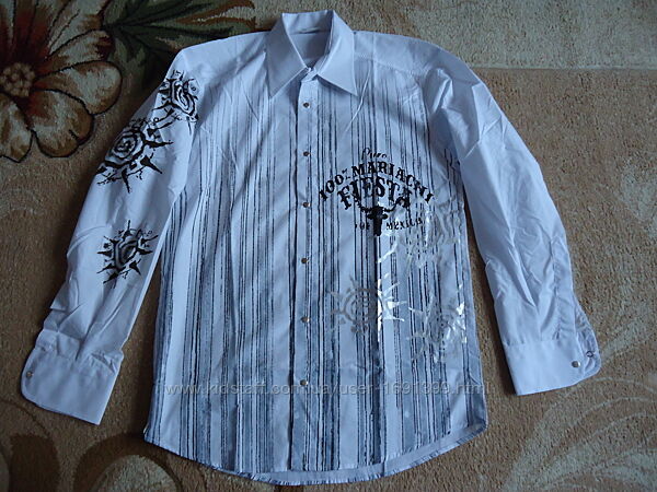 Продам дві нові сорочки (нам малі) розмір М (46-48) заміри:сорочка на кнопках по довжині 72см., рукав від плеча - 61см., комір (по колу) - 42см, плечі - 49см.