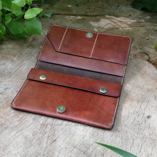 Кошелек сшит из итальянской кожи растительного дубления – материала высокого качества, произведенного в солнечной Италии. Все операции (порезка, проделка отверстий, окрашивание, установка фурнитуры, сшивание) выполнены исключительно вручную.