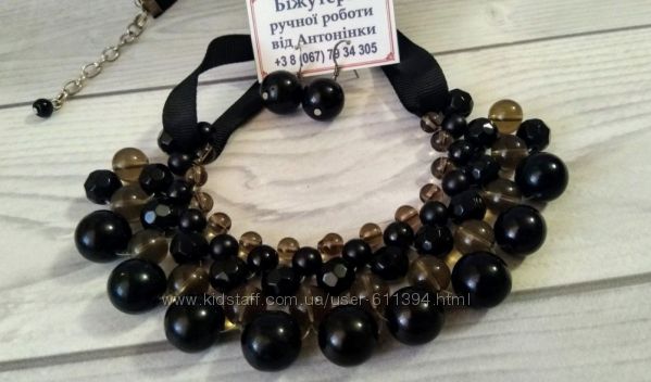 Металофурнітура під срібло, димчате венеціанське скло, граньоване чорное скло, чорне скло, силіконові заглушки на швензах з медсталі (вушка не болять), чорна репсова стрічка.Довжина сережок 3,1 см.