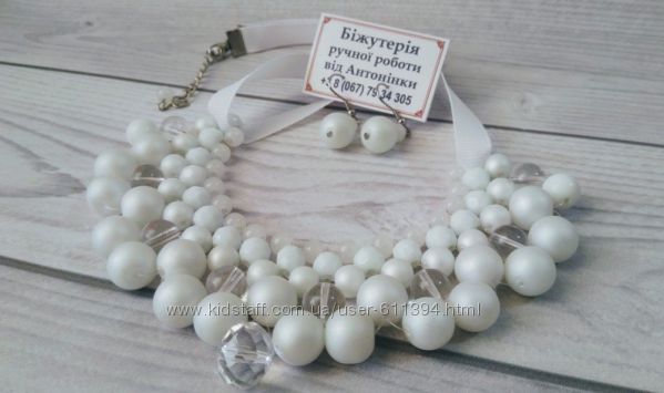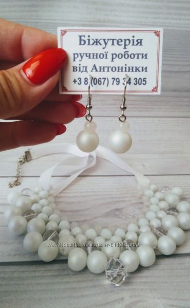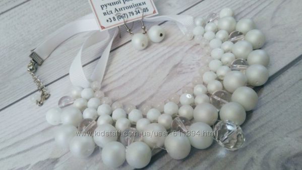 Металофурнітура, матове біле венеціанське скло, кришталь граньований прозорий, граньоване біле чешське скло, прозоре чешськое скло, біле напівпрозоре сло, силіконові заглушки на швензах з медсталі (вушка не болят), біла репсова стрічка, ланцюжок - подовжувач.Довжина сережок 3,8 см.