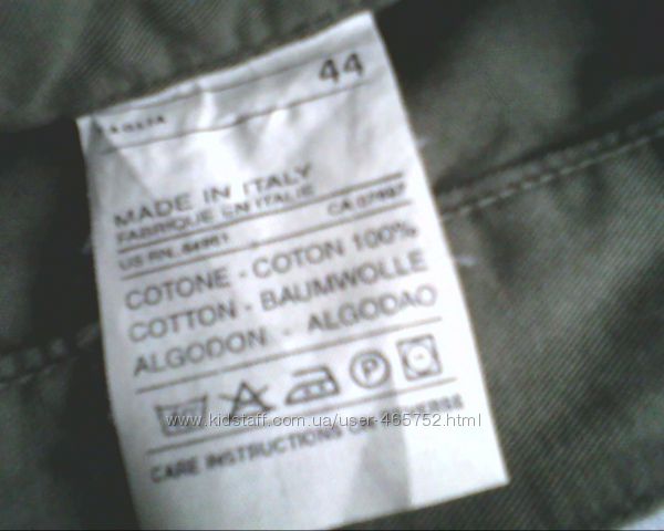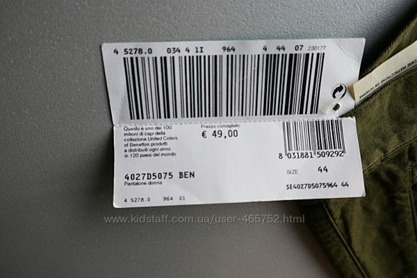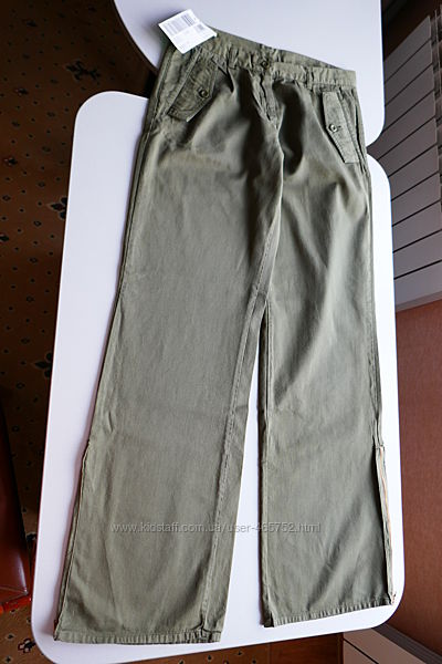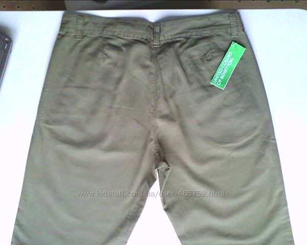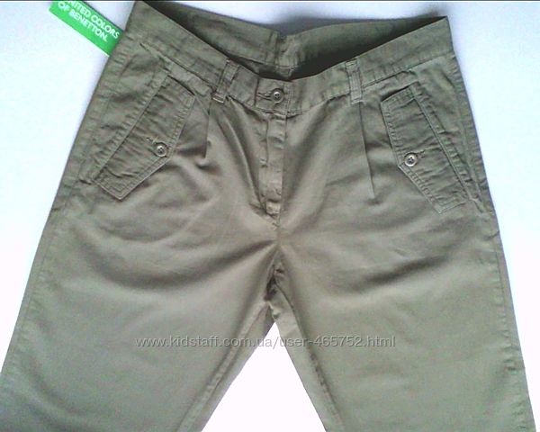 Размер указан евро 44, н а наш 46/48. С бирками. Новая вещь.Модные итальянские женские брюки от известного бренда United Colors Of Benetton красивого темно оливкового цвета. Брюки изготовлены из качественного материала – хлопка. Ткань практически не мнется. Эластичный пояс резинкой с красивым шнурком для регулировки ширины. Прямой крой. Очень удобная и комфортная модель.