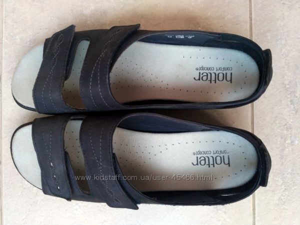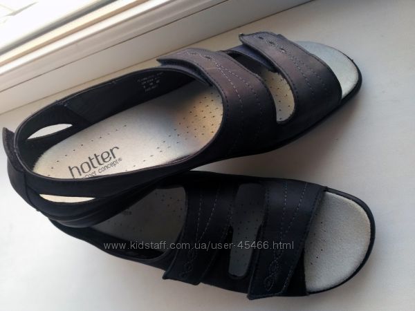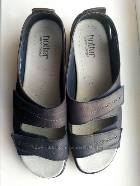 Очень качественные, мягкие, лёгкие и удобные кожаные туфли фирмы Hotter (comfort concept), Англия, в них можно целый день ходить, как в тапочках. Размер UK 8 / EUR 42, по стельке 26,3см, стелька очень мягкая, комфортная, съемная, на липучках - очень удобно. Подойдут на любую ширину ноги, т.к. сверху на 2 липучках, устойчивая пятка.Цвет темно-синий, практически черный.