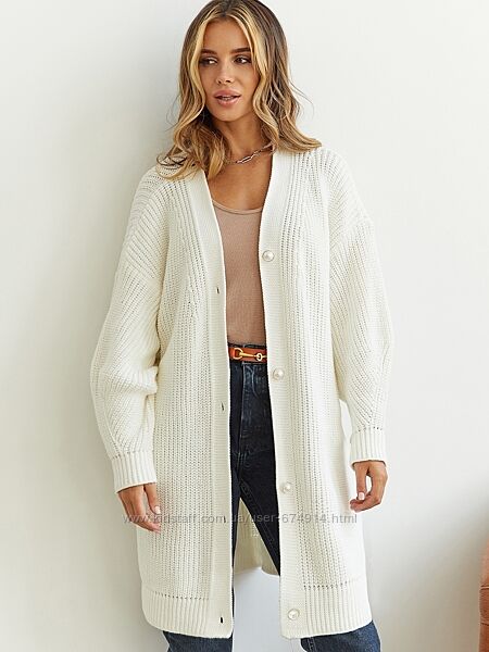 Вязаный кардиган со спущенной линией плечевого шва и пуговицами в виде жемчужин.