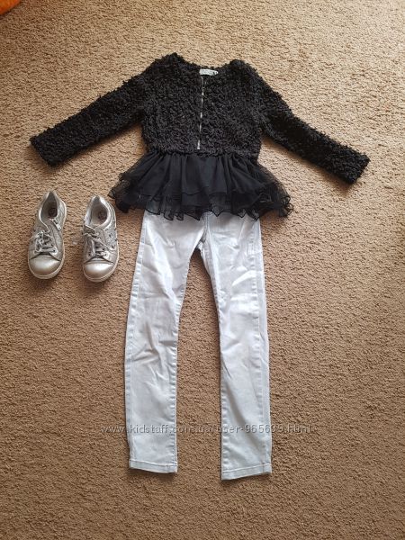 Продам крутой комплект для девочки:кофточка фирмы "Richie House"- и брючки фирмы"Reserved", в хорошем состоянии.Кофточка-имитация меха каракулевого с пышным фатином внизу.Размер-пишется 13,заказывала с американского сайта,оринтировочно размер 116-122-128.,смотрите замеры.