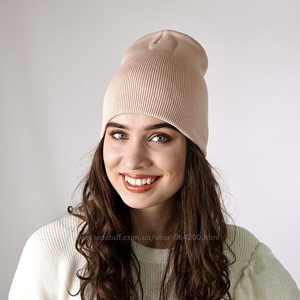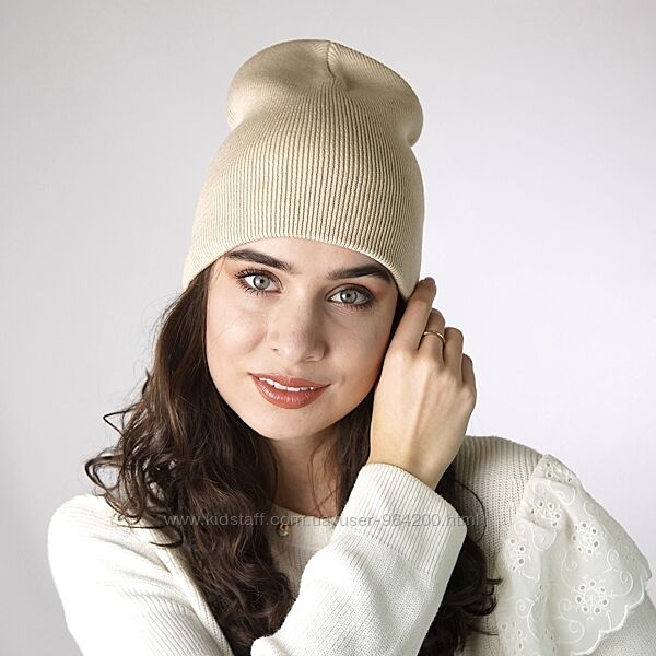Шапочка подвійна, без підкладки, приємна на дотик, машинна в’язка в мілкий рубчик, комфортна на голові, зручна посадка, тягнется.