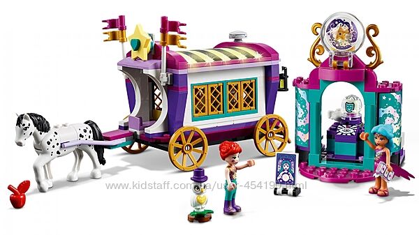 Конструктор LEGO Friends 41688 Волшебный фургонВы готовы отправиться в мир мистической магии? Добро пожаловать в волшебный караван! Миа пришла к гадалке Клэр, которая может заглянуть в будущее. Заходите в фургон и поздоровайтесь с мудрой совой Спейдс. Заварите чай на плите и угостите лошадь яблоком. Заходите в палатку к Клэр, чтобы она прочитала судьбу Мии. Хрустальный шар кружится и показывает... счастливое лицо! Может быть, Мие повезет на ярмарке?