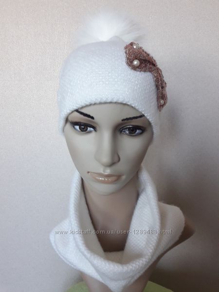 Красивый,яркий,уютный ангоровый комплект:шапка с помпоном и бафф,на флисе,52-56Цвета в наличии: