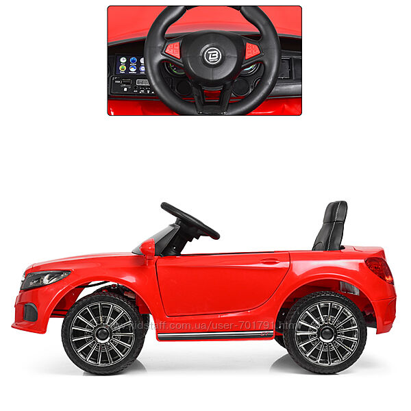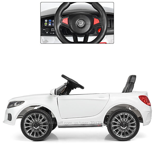 Детский электромобиль предназначен для детей от 3 лет.Приводится в движение как самим ребёнком путём нажатия кнопки "Старт", так и с помощью пульта дистанционного управления 2,4G.При старте слышен соответствующий звук, а также возможны "медленный старт" и "медленный стоп".Электромобиль имеет 1 посадочное кожаное сиденье.Посадочное место оборудовано 5-ти точечными ремнями безопасности.Передние фары светятся.Свет включается/выключается кнопкой.Сигнал на руле.Предусмотрена регулировка громкости.Музыка развлечёт ребенка во время езды.Двери электромобиля открываются в стороны.Для удобства транспортировки предусмотрена дополнительная ручка.Предусмотрен открывающийся багажник.Возможно подключение Bluetooth (STOP BUTTON), а также есть MP3, USB.4 колеса выполнены из Eva-материала.Имеет 1 скорость движения в машине и 3 скорости движения на пульте.Скорость: до 3 км/час.Движение вперёд и назад переключается тумблером.Мощность двигателя: 2х12V/25W/RPM16000.Аккумулятор: 1х12V/5Ah. Время на зарядку: 8-12 часов.Предусмотрен индикатор заряда батареи.Размеры электромобиля (ДхШ(по колёсам)хВ): 94х48,5х43 см.Ширина электромобиля по зеркалам: 53 см.Диаметр колеса: 19 см. Диаметр диска: 15 см. Вес: 10 кг.Размер упаковки: 96х48х24 см.Вес с упаковкой: 12 кг.Максимальная нагрузка: 25 кг.