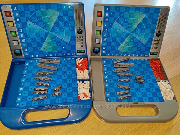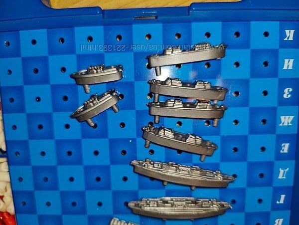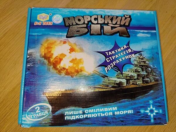 Класична стратегічна ігра. В коробці, 2 ігрових поля, фішки-кораблі - 20 шт., фішки. У 4 корабликів відломаний один фіксатор (на гру особливо не впливає, оскільки "своє" поле із корабликами знаходиться внизу на горизонтальній поверхні. У ціну враховано.