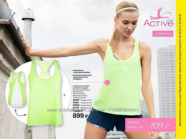 Создай фигуру своей мечты с коллекцией спортивных товаров Avon Active!Женский топ прекрасно подойдет как для спортивных, так и для повседневных занятий. Топ хорошо сочетается со спортивной одеждой из этой же коллекции. Уменьшена спортивная пройма и вставка на спине создадут дополнительный комфорт во время тренировок.