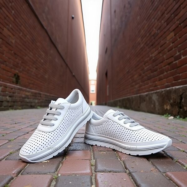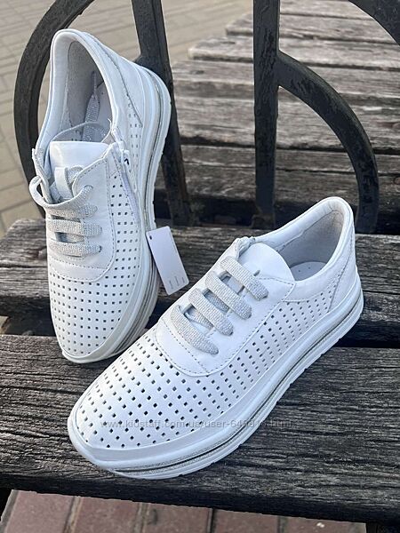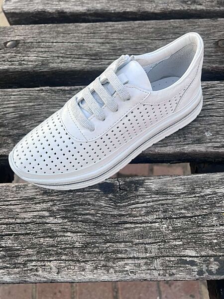 Білі кросівки з перфорацією та сріблястими вставками — тренд весни 2024Модель для юних модниць: натуральна шкіра, м’який задник, зручна колодка. Комфорт на кожен день, легко комбінуються з джинсами, сукнею чи кюлотами.