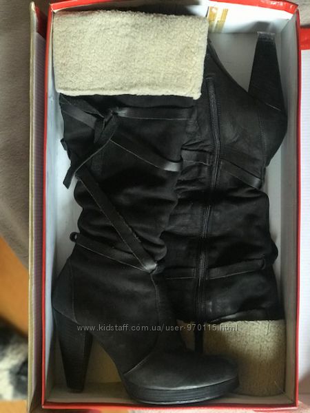 Зимние женские высокие сапоги на каблуке. Красивые, удобные, очень качественные.Полностью натуральные материалы. Низ - натуральная кожа, верх - натуральные нубук, внутри - набивная овчина по всей высоте.