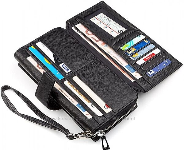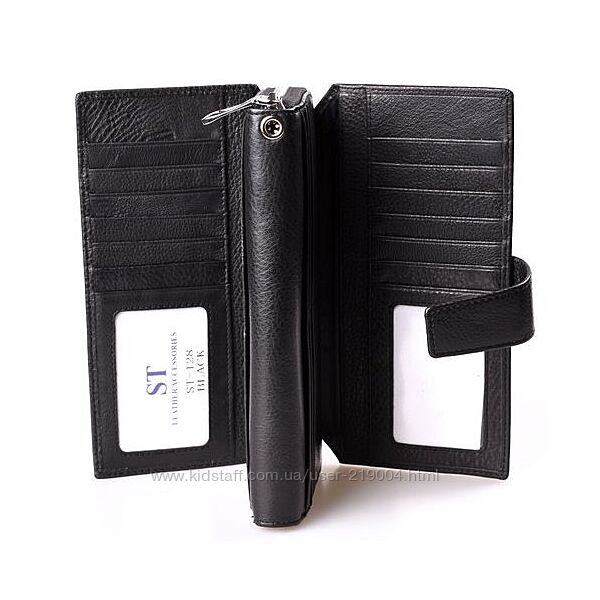 Кошелек из натуральной кожи отличного качества,включая внутренности! Артикул: ST 228 Женский кожаный кошелек клатч ST на молнии с визитницей. Под молнией - два отдела для купюр и отдел на молнии, с двух сторон кошелька есть два откидных клапана с дополнительными карманами для купюр (6 карманов) и 21 карман для карт. В комплекте ручка на запястье. Размер в см, 10,5*20,5*3,5. Поставляется в фирменной коробке.