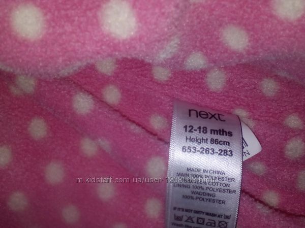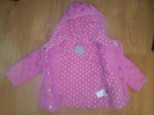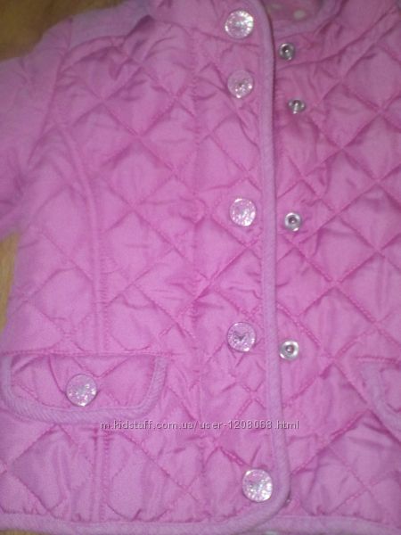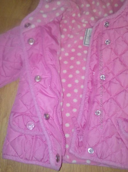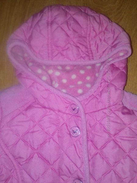 Стеганая куртка розовогоо цвета,ТМ Next,с капюшоном,застегивается на молнию и планку на кнопках.На нижней части переда-2 кармана, подкладка флисовая, синтепон.Очень красивые кнопки. Замеры: Длина-34,5 см Длина рукава от плеча-32,5 Длина рукава снизу-20,5 см Ширина плечей-27,5 см Плечо-5,5см Ширина под мышками-30,5 см Отличное состояние. Ваш ребенок не останется незамеченным в такой курточке. ДДоставка Новая почта.
