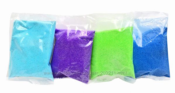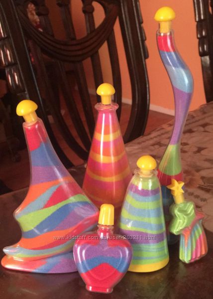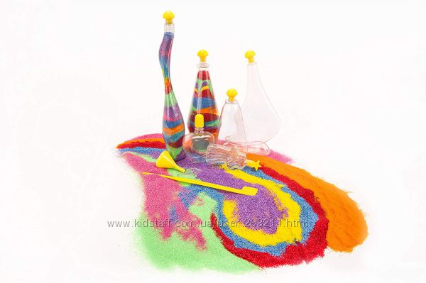 В наборе: 4 бутылочки для песка, два кулона-бутылочки, 8 цветов песка (100 грамм каждый), крепкая нить, пластиковая воронка, инструмент для распределения песка, легкие инструкции.