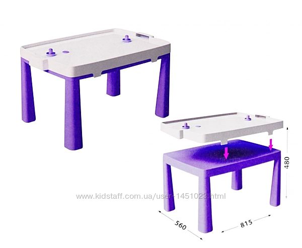 Пластиковый стол 2 в 1. Легко складывается. Изготовлен из качественного пластика (полипропилена). Можно собирать как стол с игровой панелью для аэрохоккея, или как обычный столик. Также в комплекте есть 2 биты и 2 шайбы для игры. Игроки становятся по разные стороны стола и с помощью бит для аэрохоккея пытаются попасть шайбой в ворота противника. Размер стола: 56 х 81,5 х 48 см.Бренд: Doloni
