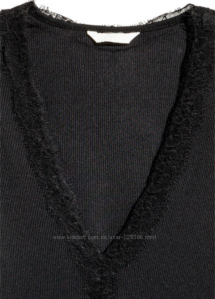 О блегающая блуза H&M из рельефного трикотажа. Глубокий треугольный вырез с кружевным кантом. Длинные рукава. Низ рукавов и нижний край обработаны оверлоком. Качество трикотажа шикарное, шелковистый на ощупь.Размер : S