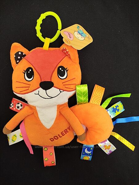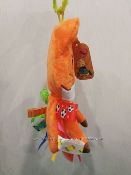 В игрушке есть погремушка в мордочке. Разноцветные ленточки, ткань разной текстуры, способствует развитию моторики.