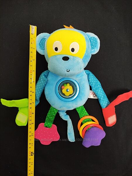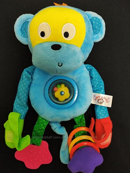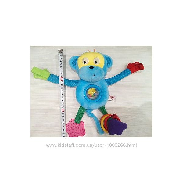 Обезьянка: Подвеска обезьянка - В пузико игрушки вшита приятная погремушка, имеющая оптимальную для малыша громкость. В мордашку вшита пищалка. На ла пках прикреплен прорезыватель и колечки (хватательный рефлекс). Хвостик - резиночка.