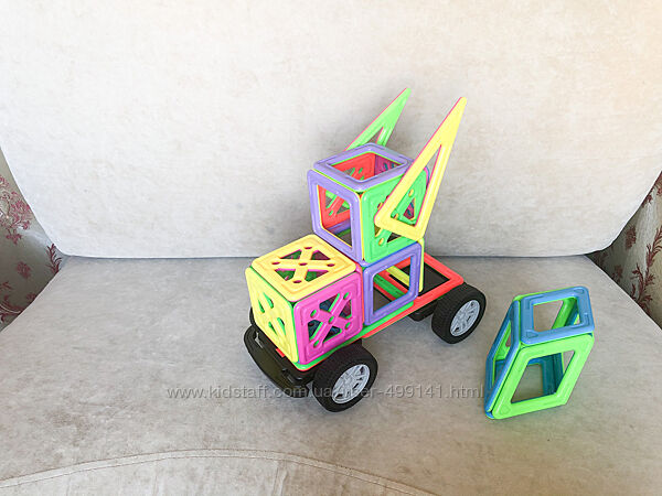 Конструктор состоит из пластиковых деталей, в которые встроенные магниты. Достаточно поднести две детали близко и они соединятся.