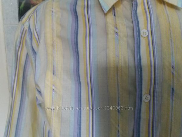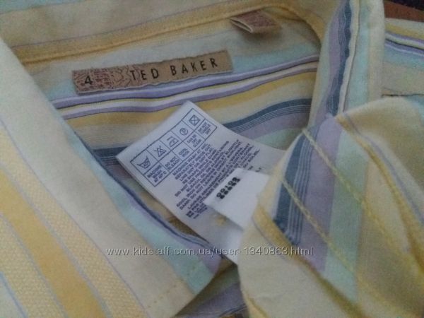 Рубашка Ted Baker. Размер указан 4 на наш L/50. Самая модная расцветка в этом и в следующем году. Преобладание приятного желтого цвета и разного размера полос.Модель закругленная внизу. Манжет на пуговице. Состав:100% хлопок