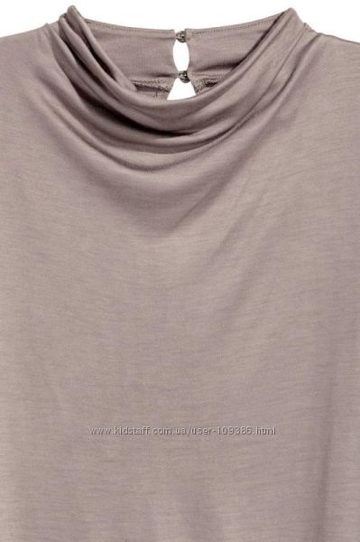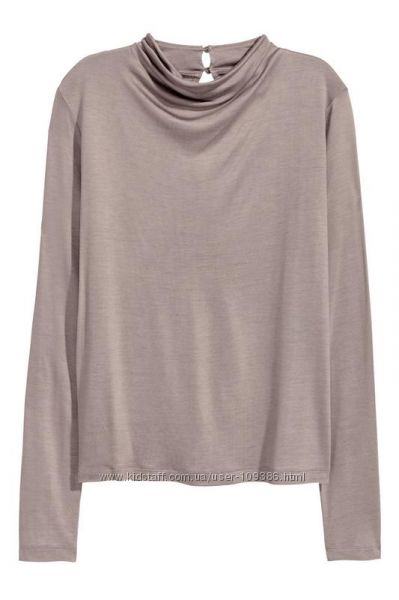 Облегающий топ Н&М из мягкого трикотажа из вискозы со слегка драпированным воротником стойкой. На топе сзади небольшой вырез, застегивающийся сверху на обтянутые тканью две пуговицы.Размер: XS.