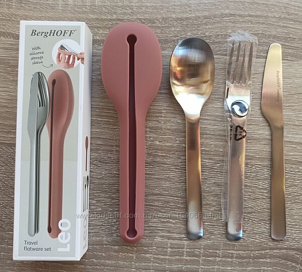 РЕАЛЬНЫЕ ФОТО ПРИЛАГАЮ!Набор столовых приборов BergHOFF Leo дорожный изготовлен из нержавеющей стали 18/10. В комплектацию входит силиконовый чехол розового цвета для безопасного и комфортного хранения. Комплектация: 1 х Вилка, 1 х Ложка, 1 х Нож, 1 х Чехол.