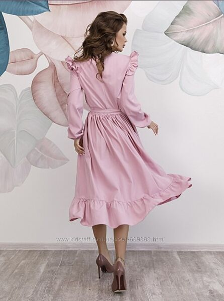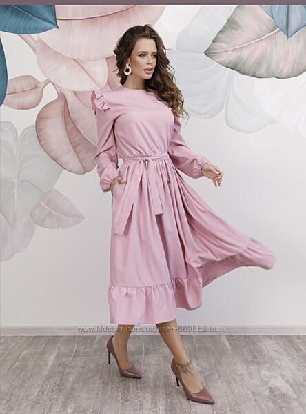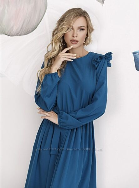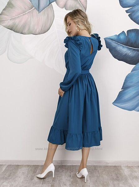 Класична сукня приталеного фасону виконана з однотонного софта. Модель міді довжини декорована рюшами на плечах і нижнім воланом. Сукня з довгими вільними рукавами на резинках в районі манжет і каплеподібним вирізом на спинці. Виріб оснащений знімним паском.Розмірний ряд: S, M, L, XL