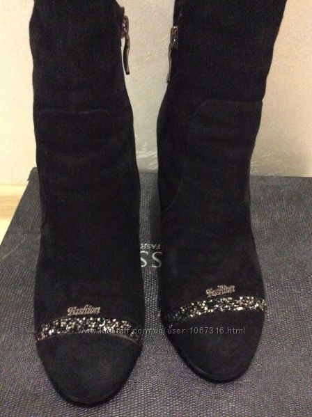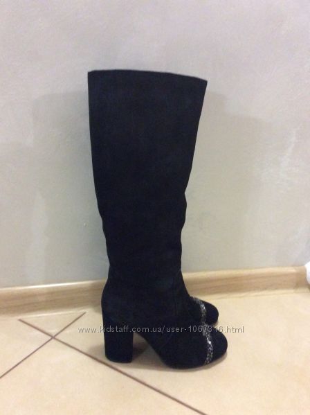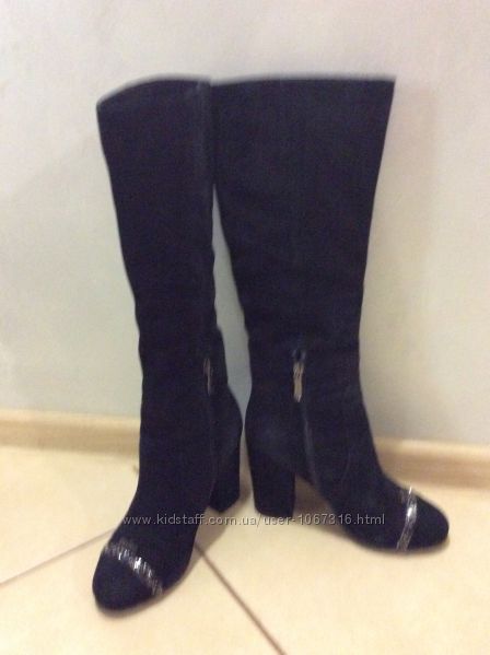 Сапоги в отличном состоянии, как новые. Носились аккуратно, только на выход. Фирма Glossi. Верх из натуральной чёрной замши. Внутри до половины из натуральной цигейки, от косточки и выше шелковистый флис. Все целое и рабочее, замш бархатистый, не запертый. Очень нарядные. Размер 36, стелька 23 ( носились с длиной ноги 23 см). Каблук 9 см, ширина каблука 4,5 см, до верху расширенный 5 см. Высота голенища от каблука 37, ширина в самом верху голенища 17,5( полуобхват), ширина в области щиколотки 12,5 ( полуобхват).В подарок дополнительные набойки к сапогам ( имеются). Хоть старые не сношены.