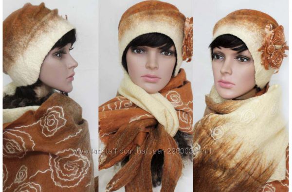 Авторский комплект – шляпка и шарф ′Панночка′ выполнен из тонкорунной мериносовой шерсти и шерстяной пряжи.