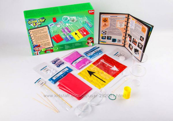 Набор включает такие эксперименты: цвета, что не смешиваются, ручной лизун, извергающийся вулкан, дрессированый осьминог и еще 7 экспериментов.