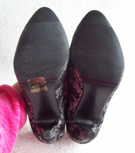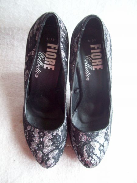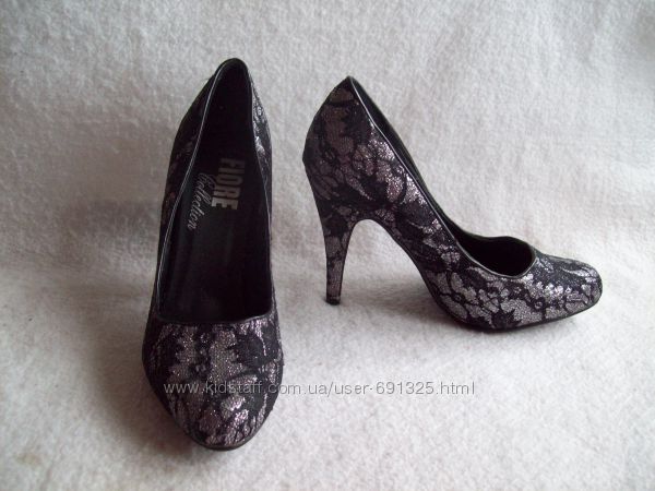 Пропоную елегантні нові туфлі від Fiore. Основа срібляста, зверху чорний гіпюр. Нові, не підійшов розмір.Розмір вказаний 39, довжина устілки всередині 25,3 см, ширина 7,5 см, каблук 11 см.