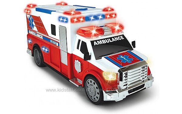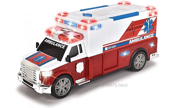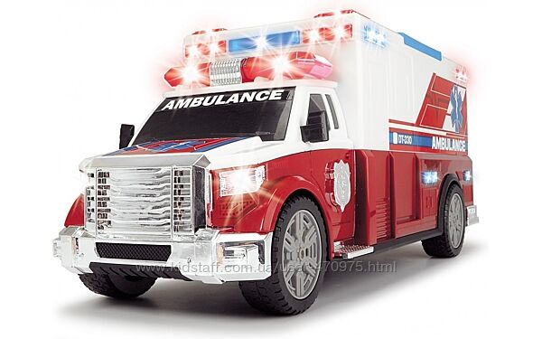 іграшкова швидка допомога Dickie Toys має сучасний деталізований дизайн кузова з відкривними задніми дверима та оснащена висувною рампою, на якій можна опустити ноші;натискання синьої кнопки зверху активує фари, мерехтіння маячків та характерний звук сирени;легкі робочі колеса дозволять малюкам вільно грати іграшковою машинкою на підлозі.