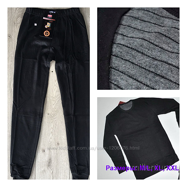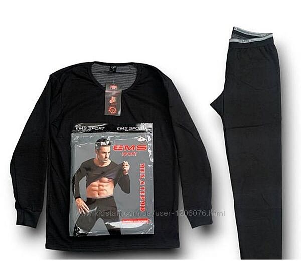 Термобелье комплект двухслойное - штаны и кофта. Цвет: черный. Кофта ТМ Veenice. Состав - 70% хлопок, 25% полиэстер, 5% спандекс. К альсоны EMS. Состав - 70% хлопок, 28% полиэстер, 2% спандекс. Мягкий, эластичный и приятный на ощупь материал. Белье скроено таким образом, чтобы не стеснять движений тела. Есть эластичные манжеты на рукавах и штанах.