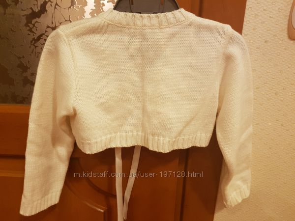 Продам кофточку-болеро из плотного трикотажа, р.98 б/у, в идеальном состоянии, красивую и нежную, украшенную перламутровыми бусинками и лентами, пр-во Украина фирма Дайс, приятного мягкого молочного цвета (не чисто белого цвета). Вообще-то это был комплект с платьем р.98, но платье носили намного чаще, его цена отдельно 50 грн, комплект отдам за 190. Замеры болеро: длина 21 см, плечо 5,5 см, рукав 31 см, ширина под мышками 25 см.Другие объявления продавца