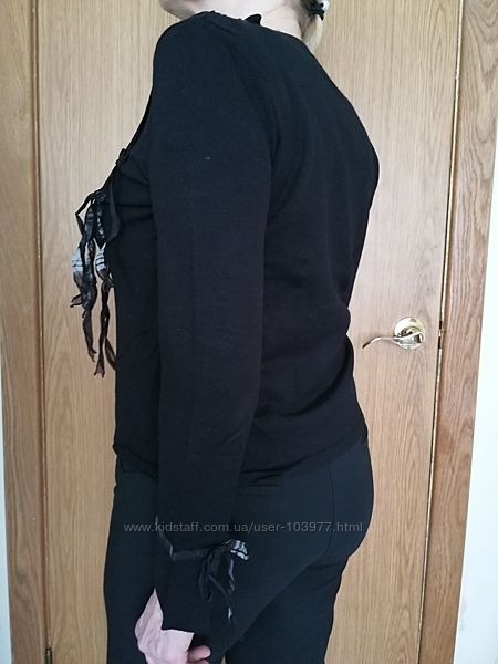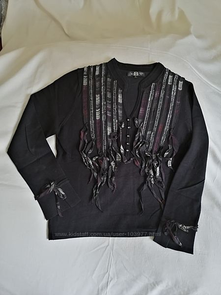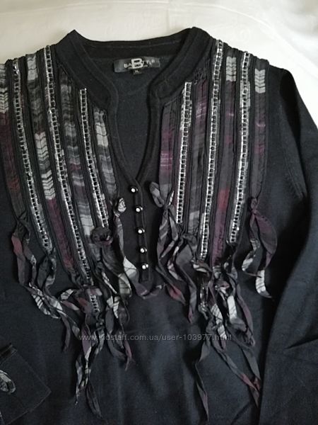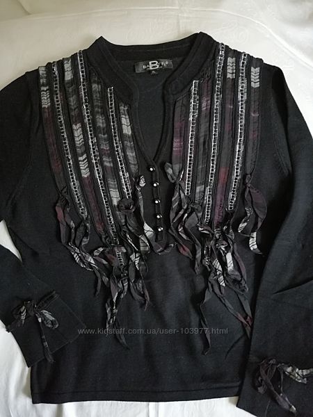 Стильная кофта от элитного французского бренда Bagutti. Оригинал. Состояние: идеальное. Размер: производителя-XL, европейский-42. Полу обхват груди-48 см, длина рукава-44 см, длина-57 см. Состав: 74% вискоза, 26% нейлон. Марка Bagutti, Paris, France. Украшена пятью блестящими пуговицами и по 3 ленты с блестящими камушками с каждой стороны, а также ленточками бордово-серо-черно-коричневого цвета. Подходит как для повседневного гардероба, так и для вечера.Размеры модели: 99-78-105, рост 169.