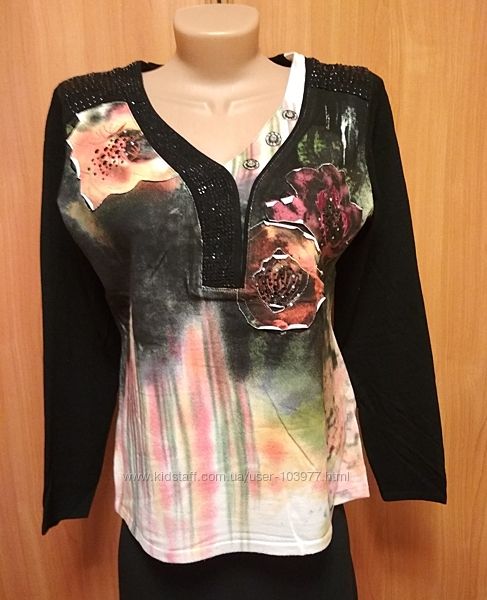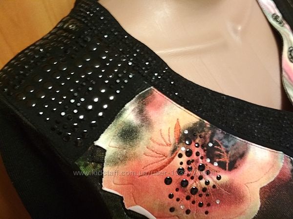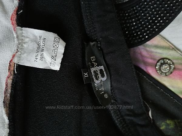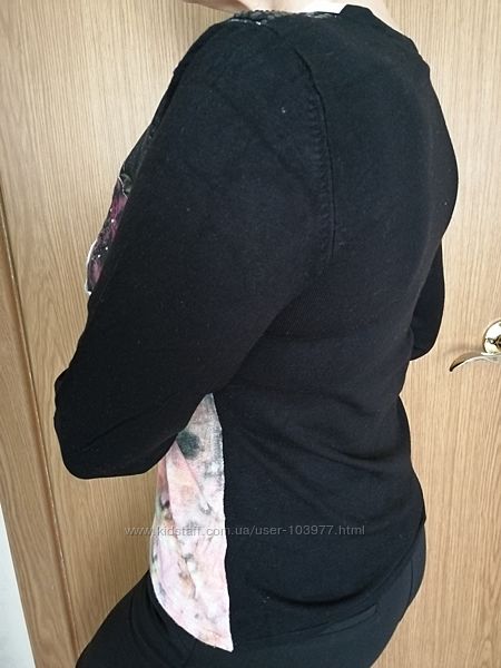 Стильная кофта от элитного французского бренда Bagutti. Оригинал. Состояние: идеальное. Размер: производителя-XL, европейский-42. Полу обхват груди-48 см, длина рукава-44 см, длина -59 см. Состав: 74% вискоза, 26% нейлон. Марка Bagutti, Paris, France. Украшена тканевыми цветами желто-лососевого цвета с бисером. На вырезе с левой стороны на желтом фоне-3 блестящие пуговицы, на правой стороне и на плечах на черном фоне -блестящие камушки. Подходит как для повседневного гардероба, так и для вечера.Размеры модели: 99-78-105, рост 169.