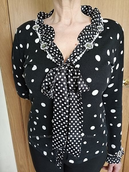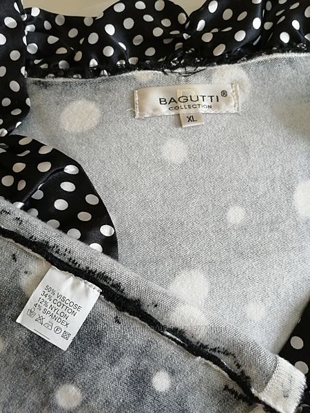 Стильный твин сет (топ+кофта) от элитного французского бренда Bagutti. Оригинал. Состояние: хорошее. Размер: производителя-XL, европейский-42. Топ: полу обхват груди-49 см, длина -60 см. Кофта: полу обхват груди-52 см, длина рукава-47 см, длина -62 см. Состав: 50% вискоза, 34% хлопок, 12% нейлон, 4% спандекс. Марка Bagutti, Paris, France.Черный в белый горошек с жемчугом и камнями на воротнике и рукавах. Подходит как для повседневного гардероба, так и для вечера.Размеры модели: 99-78-105, рост 169.