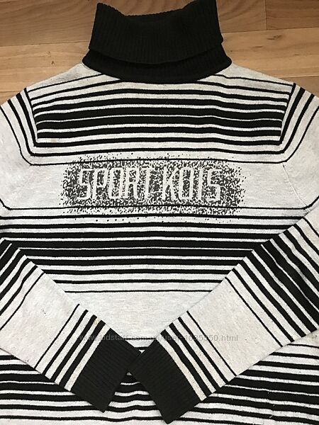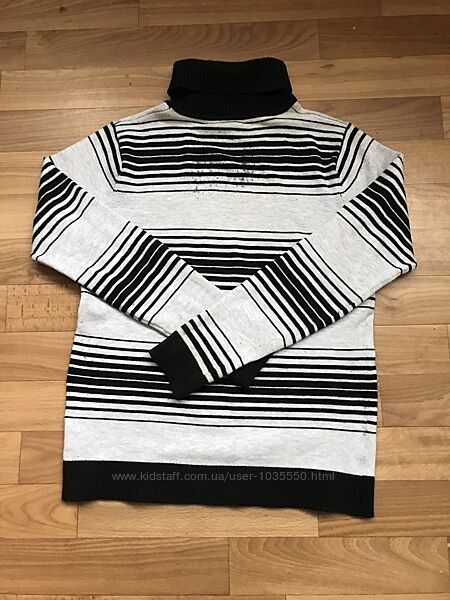 Кашемировый свитер на мальчика от бренда Many &many.Цвет чёрный/серый.Размеры 140,146р.Модель выполнена из кашемира.Идёт под высокое горло.Спереди и сзади рисунок в полоску.Горло однотонное чёрного цвета.Рукава длинные с манжетом.Свитер б/у,но в отличном состоянии.