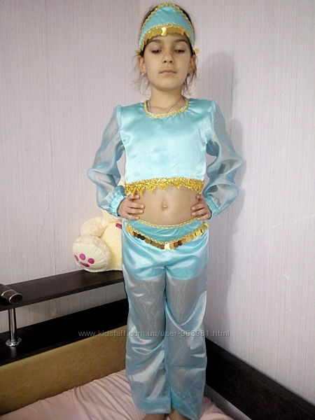 Костюм восточной красавицы. Есть в других цветах, больше фото на вайбер. Возможен пошив по вашим меркам, так же можно сделать топик длиннее, закрыть животик.Костюм состоит из штанов, топа и шапочки. Дополнительно можно заказать вуаль на лицо +20 гривен, или головной убор как на фото 5 +30 гривен.Размеры 98-122 500гривен