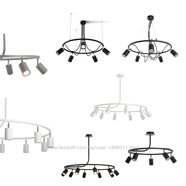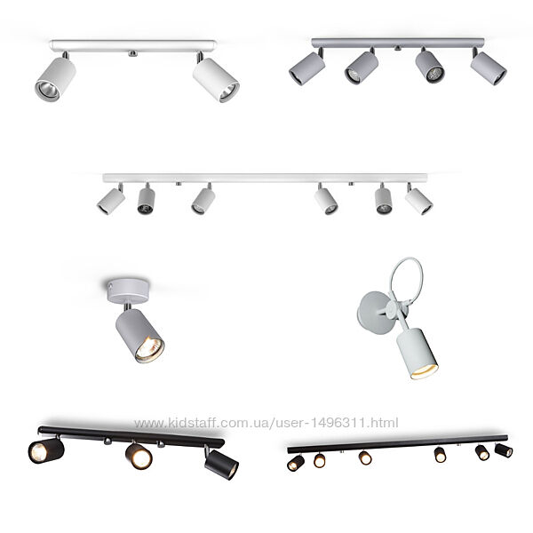 Колекція світильників спрямованого світла точкові накладні підвісні споти та спот-системи багатолампові (Україна)Колір чорний, білий, сірий.