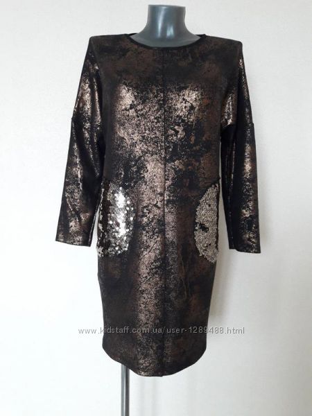 Шикарное,эффектное,нарядное праздничное платье-мини,оверсайзКрасивая торжественная модель длины мини.Модель-оверсайз,свободного кроя,слегка зауженна к низу.С заниженной линией плеча.Платье выполнено из ткани под кашемир.Полочка(передняя часть)модели с золотым(серебряным)напылением и декорирована карманами-обманками с пайеток.