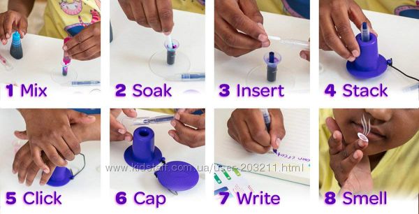В наборе: компоненты для 36 мини маркеров, 3 бутылочки ароматных чернил, емкость для измерения, специальный инструмент Snapping Tool, наклейки-раскраски один лист, инструкции.