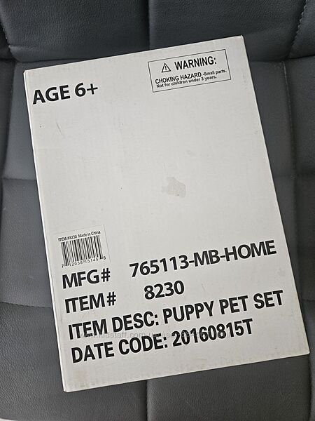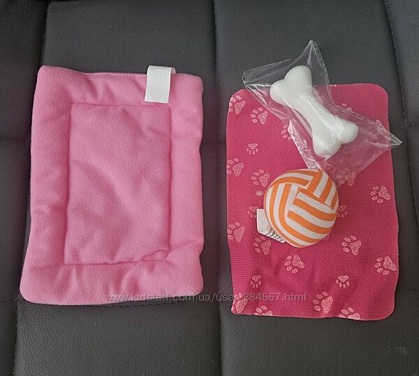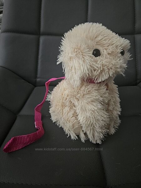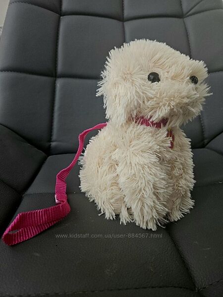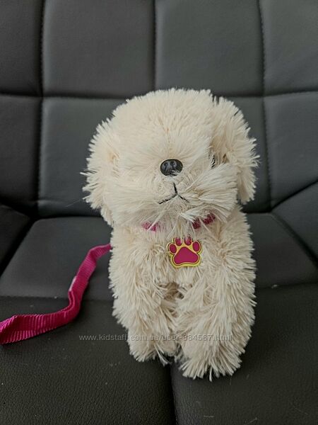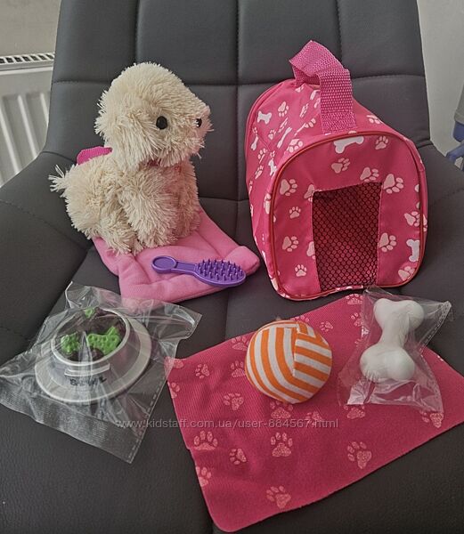Оригинал из Америки.Милый плюшевый щенок с аксессуарами. Набор включает в себя: щенка, сумку - переноску, коврик и одеяло, поводок, теннисный мяч, кость, миску с едой и щетку для расчесывания. Поводок крепится к шее щенка на липучке.